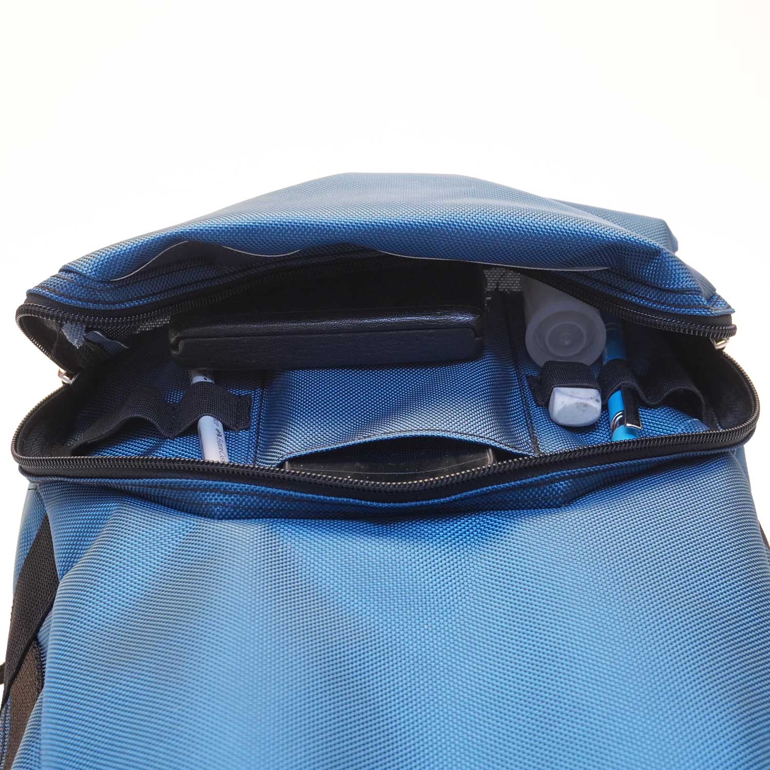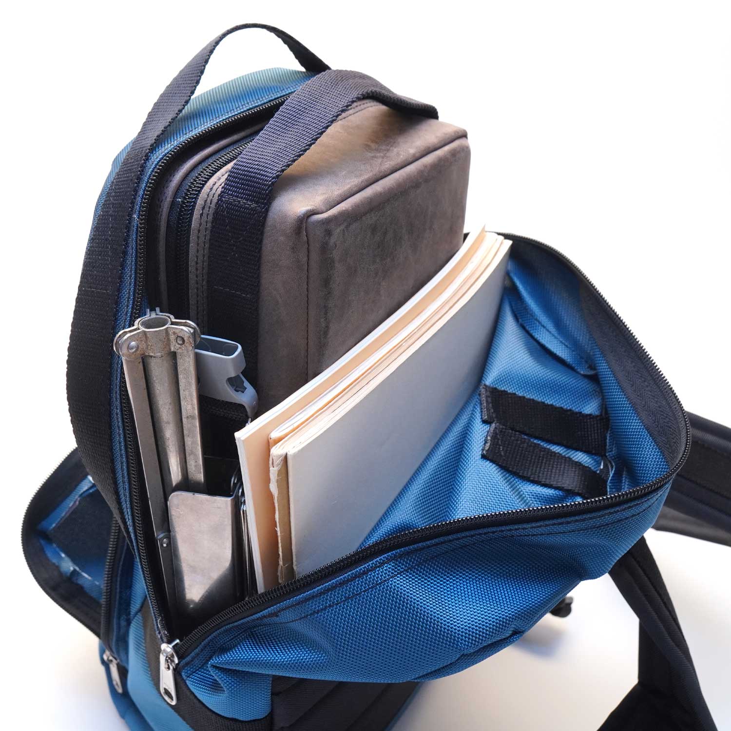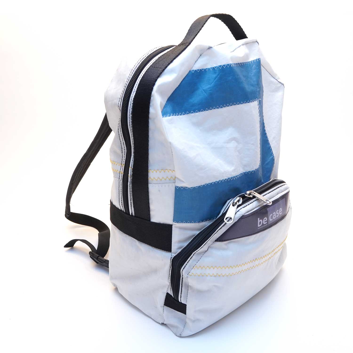 Erhältlich wahlweise in Polyester/Ozeanblau oder veganem Synthetik- Leder/Kupferbronze oder upgecyceltes Segeltuch oder schwarz/rotem Cordura Aramid-verstärkt. Alle Materialien sind stark wasserabweisend.